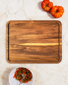 Thoughtfully designed, large wood cutting board for food prep and artful serve.